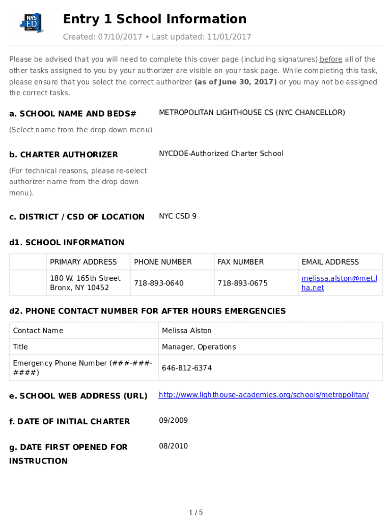 Entry 1 School Information Created: 07/10/2017 Last updated: 11/01/2017 Please be advised that you will need to complete this cover page (including signatures) before all the other tasks assigned