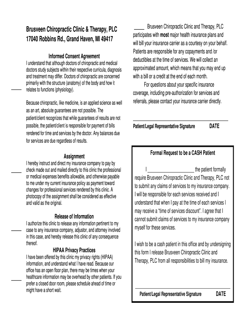 Brustein Chiropractic Clinic & Therapy, PLC 17040 Robbins Rd., Grand Haven, MI 49417 Informed Consent Agreement I understand that although doctors of chiropractic and medical doctors study subjects
