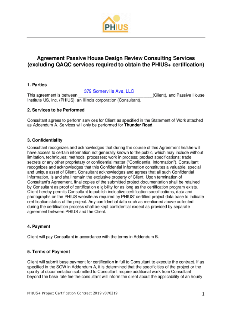 Agreement Passive House Design Review Consulting Services (excluding AQC services required to obtain the PRIUS+ certification)1. Parties379 Somerville Ave, This agreement is between (Client), and