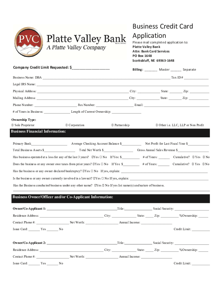 BusinessCreditCard Application CompanyCreditLimitRequested:$ Pleasemailcompletedapplicationto: PlatteValleyBank Attn:BankCardServices POBox1648 Scottsbluff,NE693631648 Billing: Master SeparateBusiness