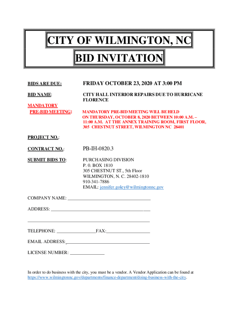 CITY OF WILMINGTON, NC BID INVITATION BIDS ARE DUE:FRIDAY, OCTOBER 23, 2020, AT 3:00 PM BID NAME:CITY HALL INTERIOR REPAIRS DUE TO HURRICANE FLORENCEMANDATORY PREBID MEETING:MANDATORY PREBID MEETING