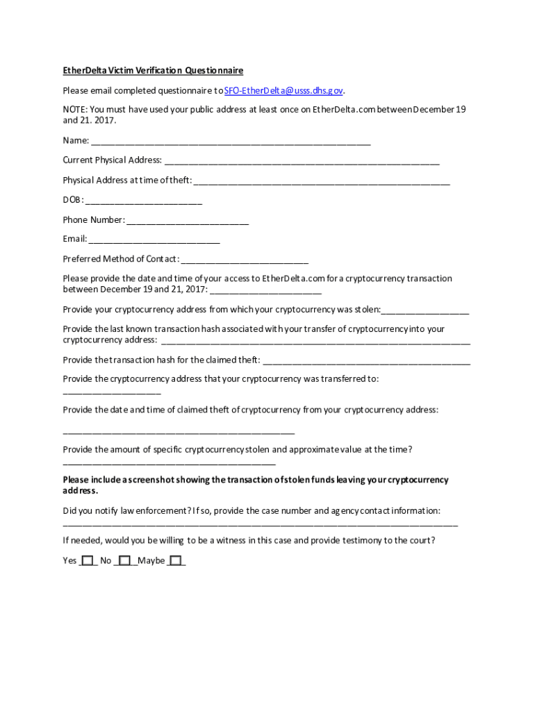 Get the free EtherDelta Victim Verification Questionnaire Please email ...