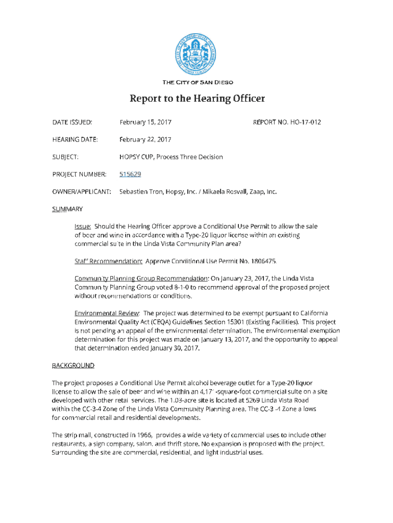 THE CITY OF SAN DIEGOReport to the Hearing Officer DATE ISSUED:February 15, 2017REPORT NO. H017012HEARING DATE:February 22, 2017SUBJECT:HOPS CUP, Process Three DecisionPROJECT NUMBER:515629OWNER/APPLICANT:Sebastien