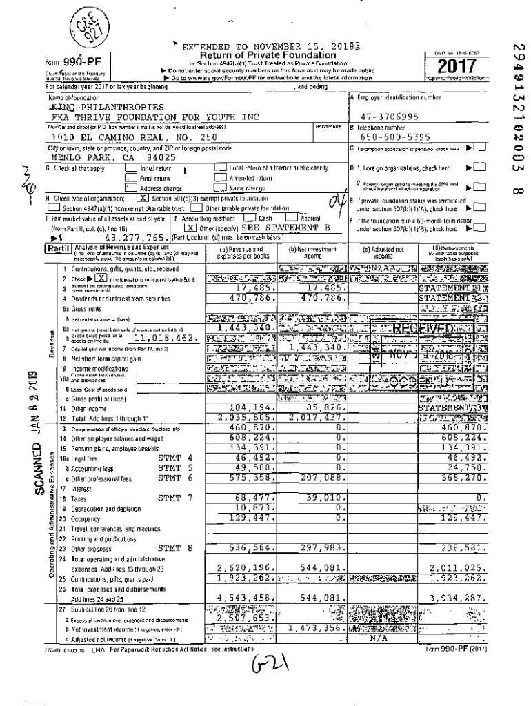 EXTENDED TO NOVEMBER 15, 2016i, Return of Private Foundation990 Effort) OMB No 15450052and ending calendar year 2017 or tax year beginning Employer identification cumbersome of foundation KJ40 PHILANTHROPIES