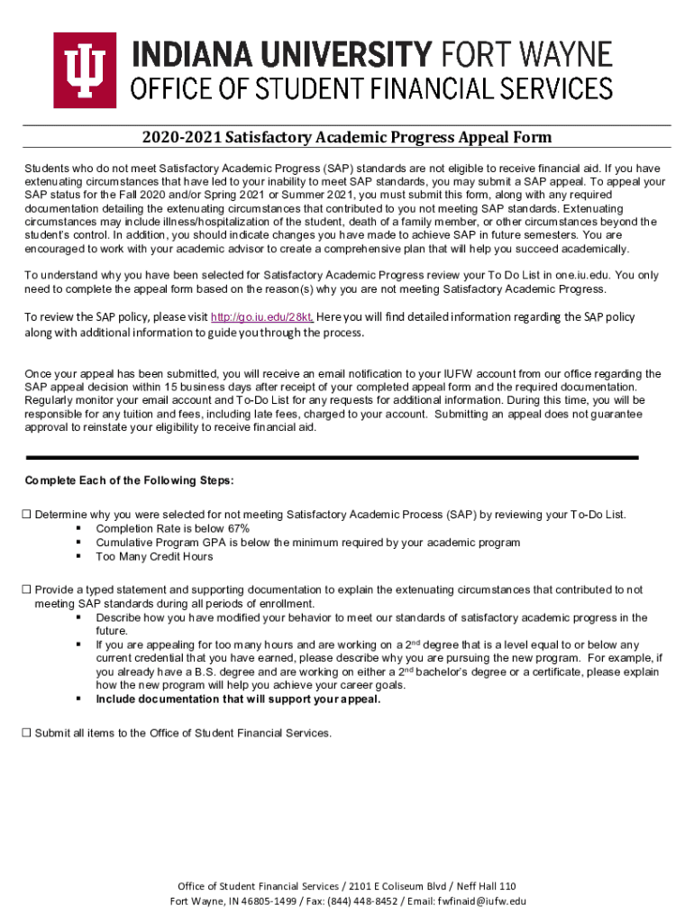 20202021 Satisfactory Academic Progress Appeal Form Students who do not meet Satisfactory Academic Progress (SAP) standards are not eligible to receive financial aid. If you have extenuating circumstances