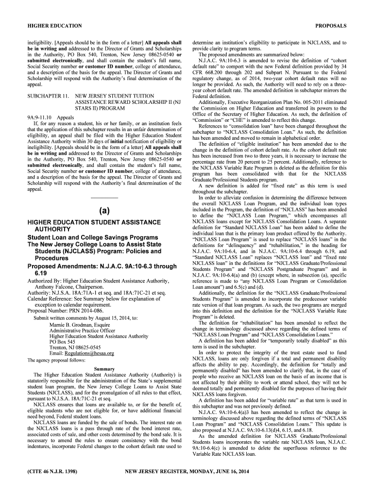 Get the free Proposed Amendments NJAC 9A 10 6 - bNew Jerseyb Higher bb - hesaa