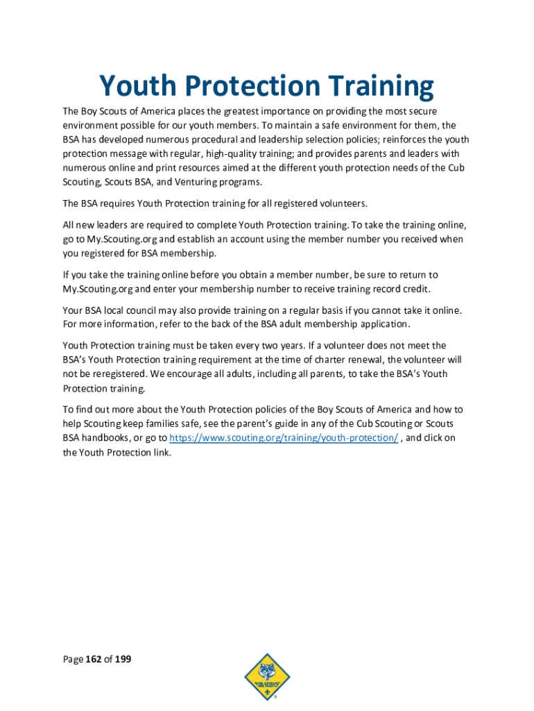 Youth Protection Training The Boy Scouts of America places the greatest importance on providing the most secure environment possible for our youth members. To maintain a safe environment for them,