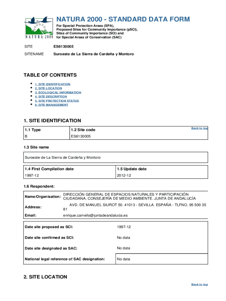 NATURAL 2000 STANDARD DATA FORM For Special Protection Areas (SPA), Proposed Sites for Community Importance (PCI), Sites of Community Importance (SCI) and for Special Areas of Conservation (SAC)SITEES6130005SITENAMESuroeste