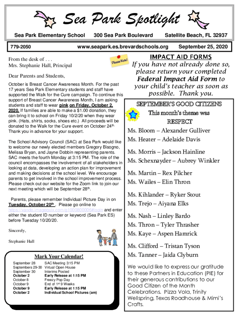 Sea Park Spotlight Sea Park Elementary School300 Sea Park BoulevardSatellite Beach, FL 32937www. Sea park.BS.brevardschools.org7792050From the desk of. . . Mrs. Stephanie Hall, Principal Dear Parents