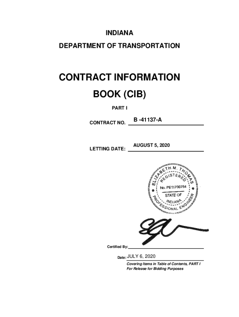 INDIANA DEPARTMENT OF TRANSPORTATIONCONTRACT INFORMATION BOOK (CIA) PART IB 41137ACONTRACT NO.AUGUST 5, 2020LETTING DATE:Certified By: Date: JULY6, 2020Covering Items in Table of Contents, PART I