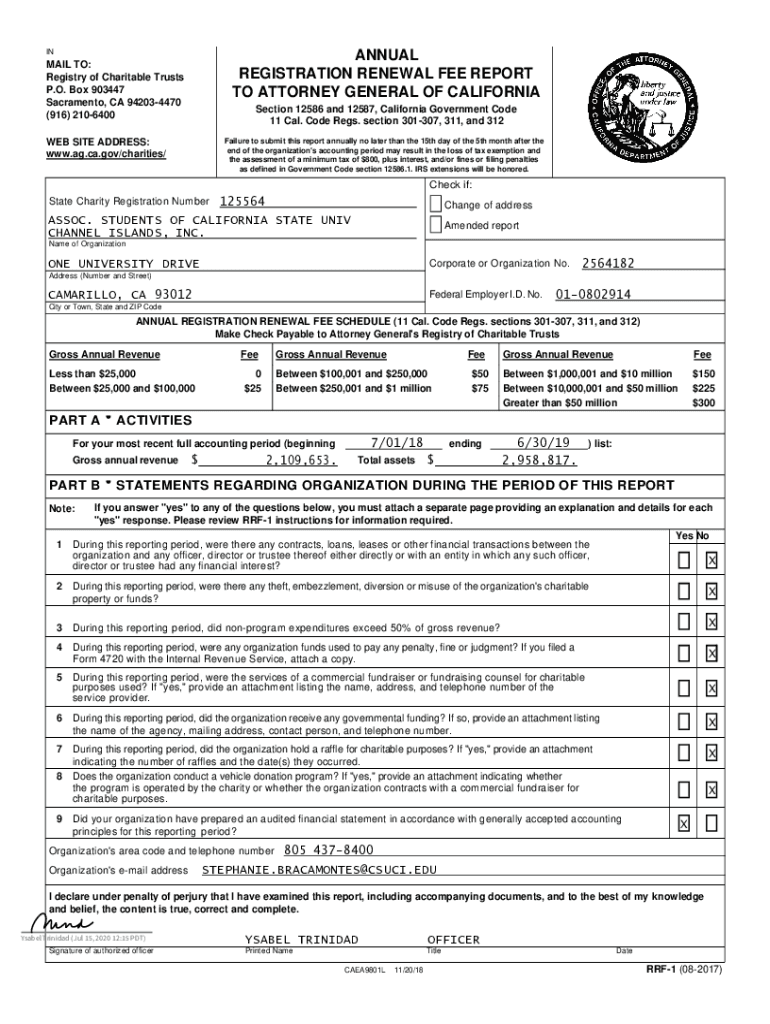 ANNUAL REGISTRATION RENEWAL FEE REPORT TO ATTORNEY GENERAL OF CALIFORNIAINMAIL TO: Registry of Charitable Trusts P.O. Box 903447 Sacramento, CA 942034470 (916) 2106400Section 12586 and 12587, California
