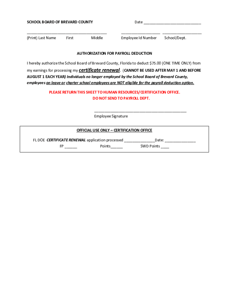 SCHOOL BOARD OF BREVARD Countywide (Print) Last Name First Middle Employee I'd Number School/Dept.AUTHORIZATION FOR PAYROLL DEDUCTION I hereby authorize the School Board of Brevard County, Florida