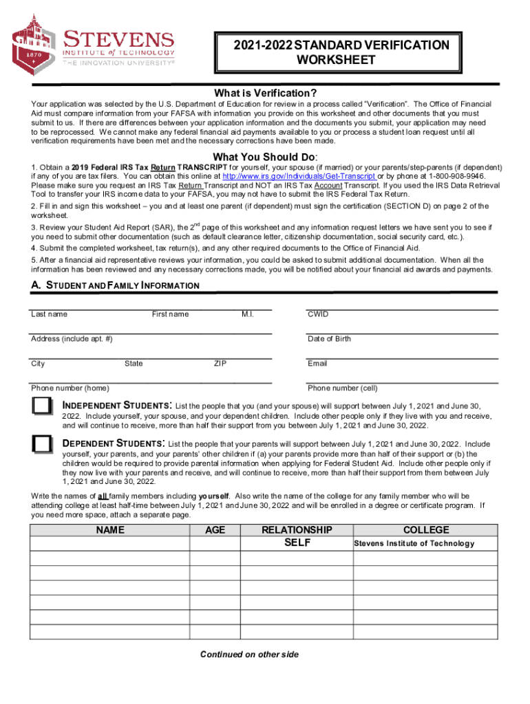 20212022 STANDARD VERIFICATION Worksheets What is Verification? Your application was selected by the U.S. Department of Education for review in a process called Verification. The Office of Financial