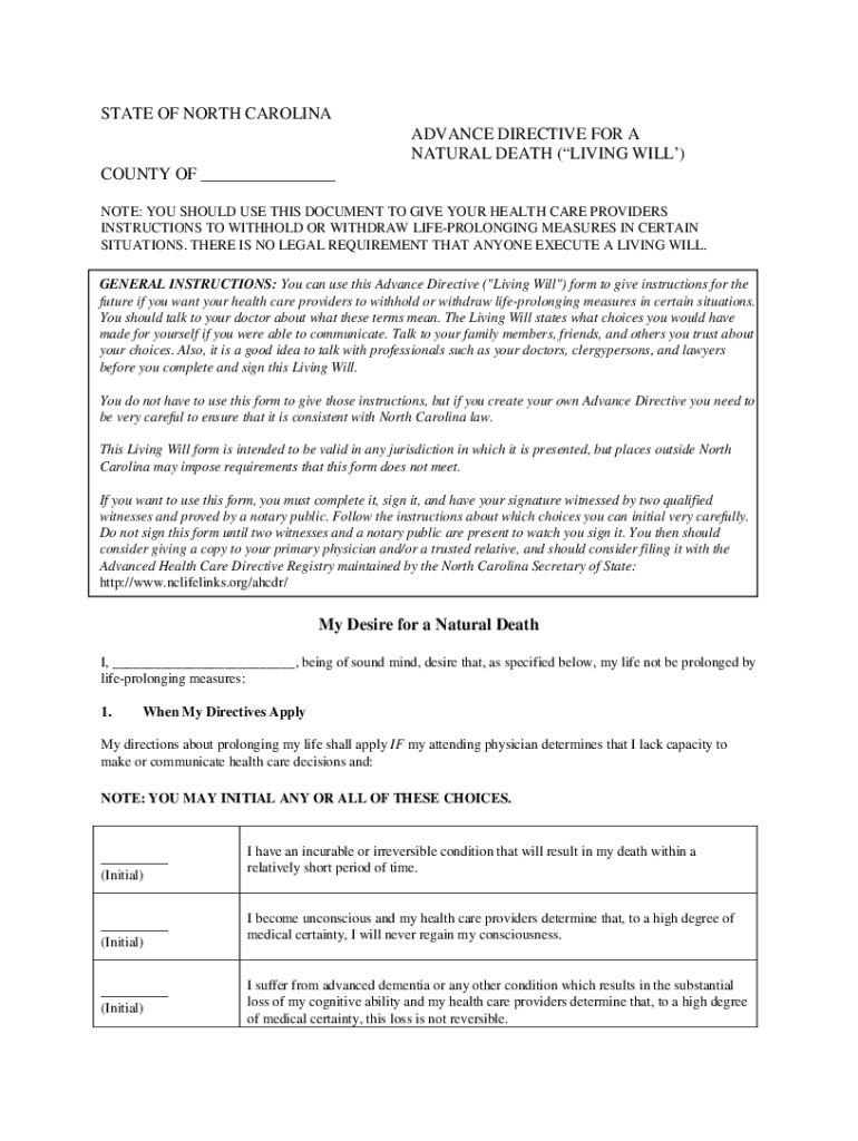 STATE OF NORTH CAROLINA ADVANCE DIRECTIVE FOR A NATURAL DEATH (LIVING WILL) COUNTY OF NOTE: YOU SHOULD USE THIS DOCUMENT TO GIVE YOUR HEALTH CARE PROVIDERS INSTRUCTIONS TO WITHHOLD OR WITHDRAW LIFEPROLONGING