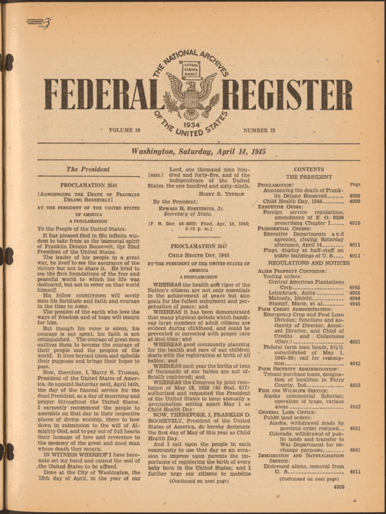 Tonal, i VC CIIL II FIJI r EU Eli/IL VOLUME 10REGISTErSy×, 934 × A flt E D NUMBER 75Washington, Saturday, April 14, 1945, The PresidentCONTENTS THE PRESIDENT Lord, one thousand nine hundred and