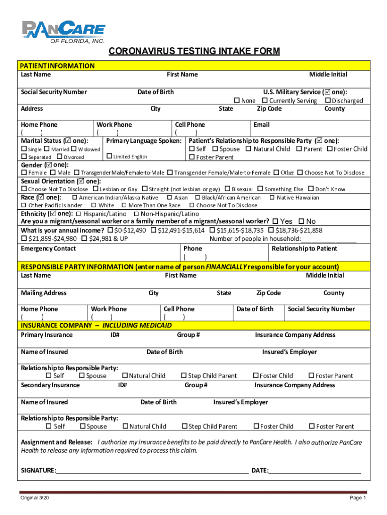 CORONAVIRUS TESTING INTAKE FORM PATIENT INFORMATION Last NameFirst Asocial Security Numerate of BirthAddressMiddle Initial U.S. Military Service (one): None Currently Serving Discharged State Zip