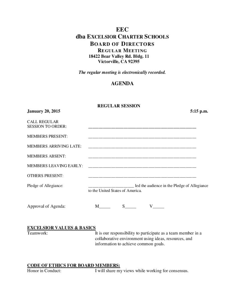 EEC DBA EXCELSIOR CHARTER SCHOOLS B BOARD OF DI RECTORS R REGULAR M YETI NG 18422 Bear Valley Rd. Bldg. 11 Victorville, CA 92395 The regular meeting is electronically recorded.AGENDAREGULAR SESSION