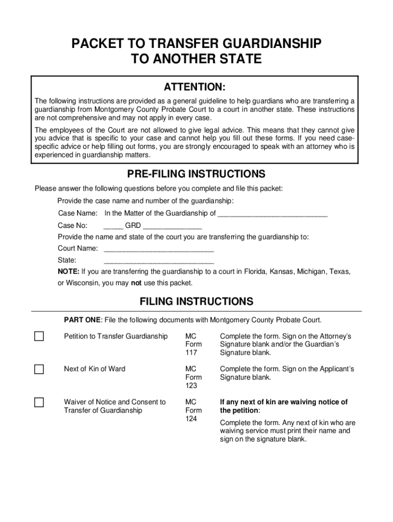 PACKET TO TRANSFER GUARDIANSHIP TO ANOTHER STATE ATTENTION: The following instructions are provided as a general guideline to help guardians who are transferring a guardianship from Montgomery County