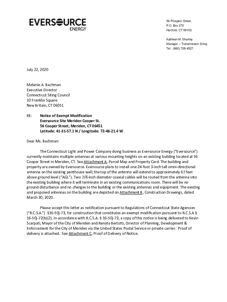 56 Prospect Street, P.O. Box 270 Hartford, CT 06103 Kathleen M. Shanley Manager Transmission Siting Tel: (860) 7284527July 22, 2020Melanie A. Bach man Executive Director Connecticut Siting Council