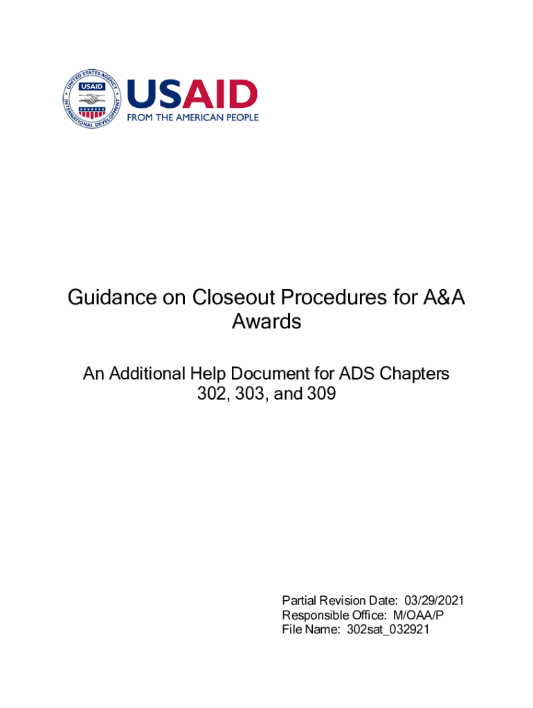 Guidance on Closeout Procedures for A&A Awards An Additional Help Document for ADS Chapters 302, 303, and 309Partial Revision Date: 03/29/2021 Responsible Office: M/OAK/P File Name: 302sat 032921Purpose