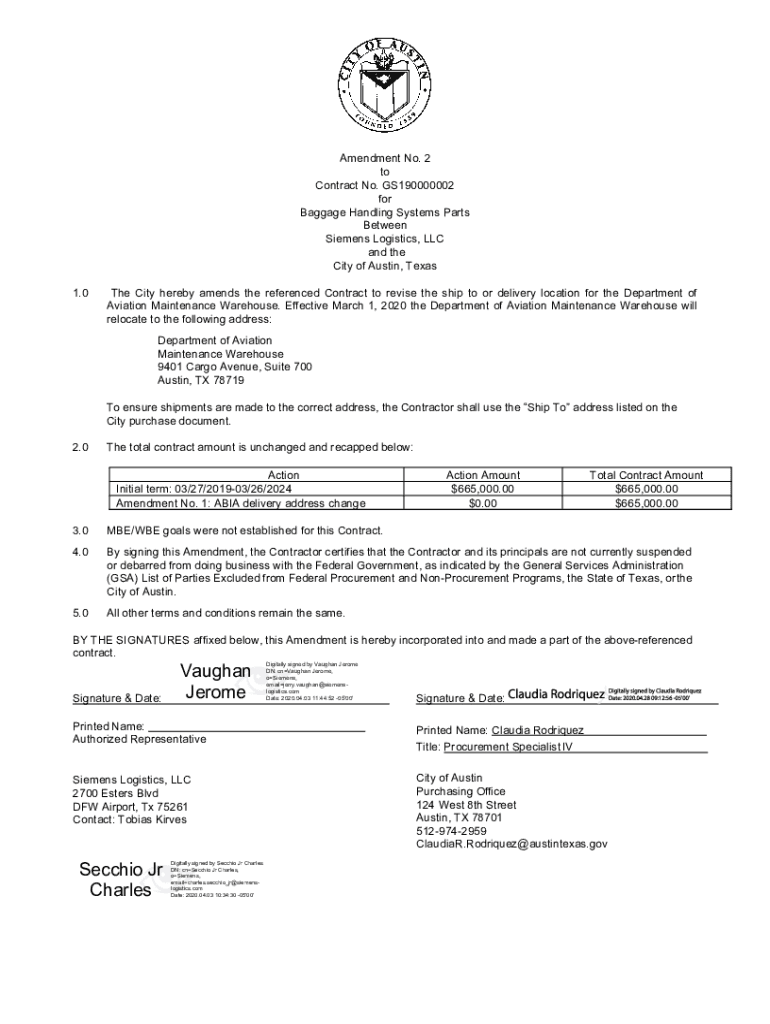 Amendment No. 2 to Contract No. GS190000002 for Baggage Handling Systems Parts Between Siemens Logistics, LLC and the City of Austin, Texas 1.0The City hereby amends the referenced Contract to revise