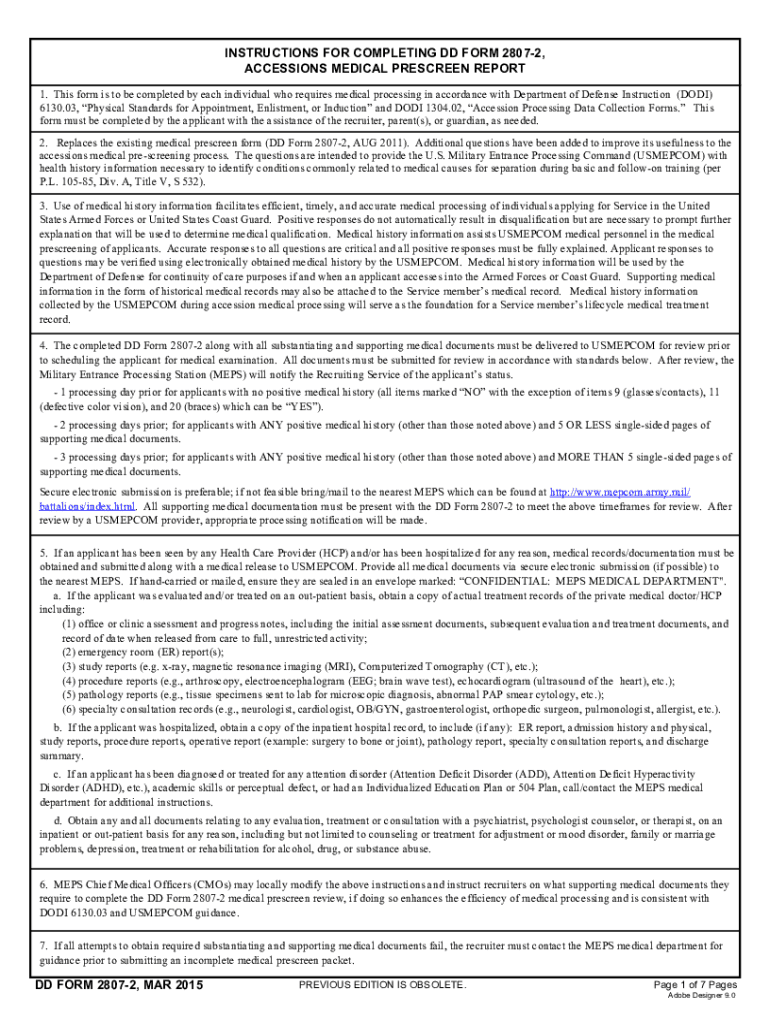 INSTRUCTIONS FOR COMPLETING DD FORM 28072, ACCESSIONS MEDICAL PRESCREEN REPORT 1. This form is to be completed by each individual who requires medical processing in accordance with Department of Defense