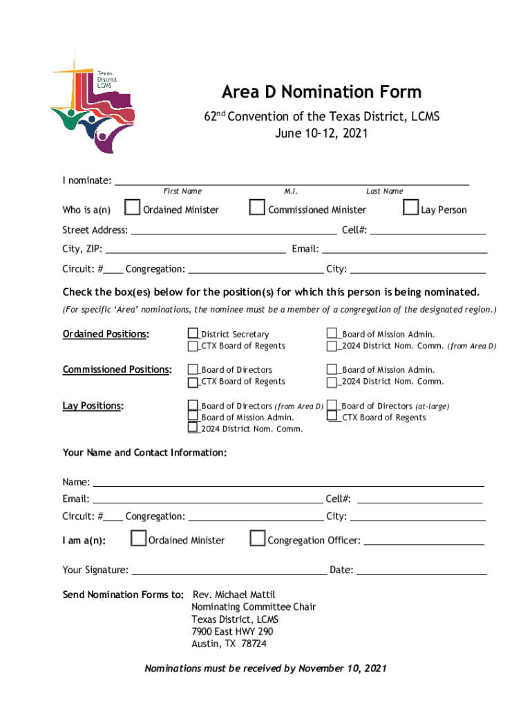 2021 Convention of the Texas District LCS NominationsPacketforAreaD Thispacketincludesthefollowing: Cover Letter with Instructions Nomination Form 2021 Election Slates with Position Descriptions List