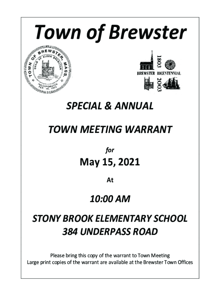 Town of Brewster SPECIAL & ANNUAL TOWN MEETING WARRANT format 15, 2021 At10:00 AM STONY BROOK ELEMENTARY SCHOOL 384 UNDERPASS ROAD Please bring this copy of the warrant to Town Meeting Large print