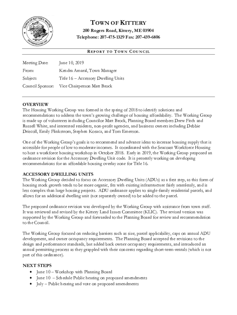 TOWN OF KITTERY200 Rogers Road, Jittery, ME 03904 Telephone: 2074751329 Fax: 2074396806 REPORT TO TOWN COUNCILMeeting Date:June 10, 2019From:Kendra Amaral, Town ManagerSubject:Title 16 Accessory Dwelling