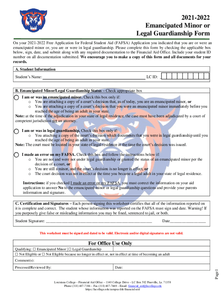 Clear Form20212022 Emancipated Minor or Legal Guardianship Form On your 20212022 Free Application for Federal Student Aid (FAFSA) Application you indicated that you are or were an emancipated minor