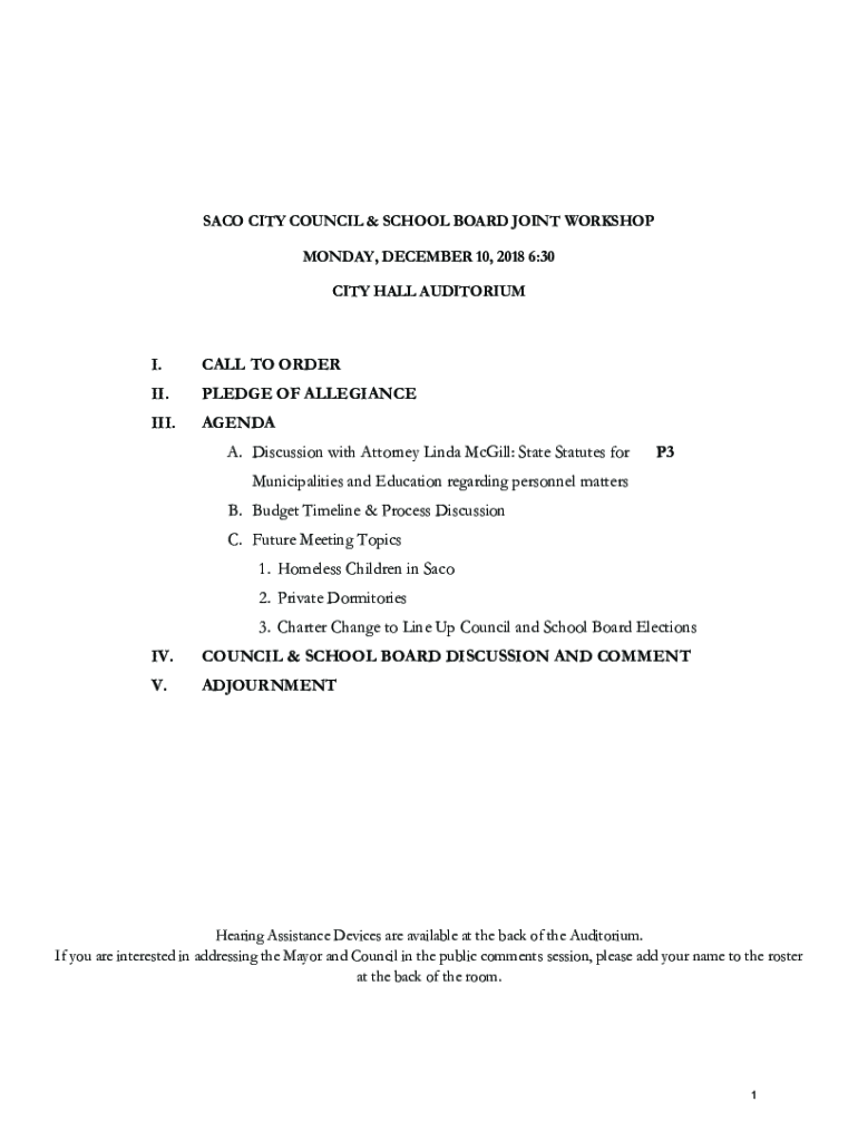 SACK CITY COUNCIL & SCHOOL BOARD JOINT WORKSHOP MONDAY, DECEMBER 10, 2018 6:30 CITY HALL AUDITORIUM.CALL TO ORDER.PLEDGE OF ALLEGIANCE.AGENDA A. Discussion with Attorney Linda McGill: State Statutes