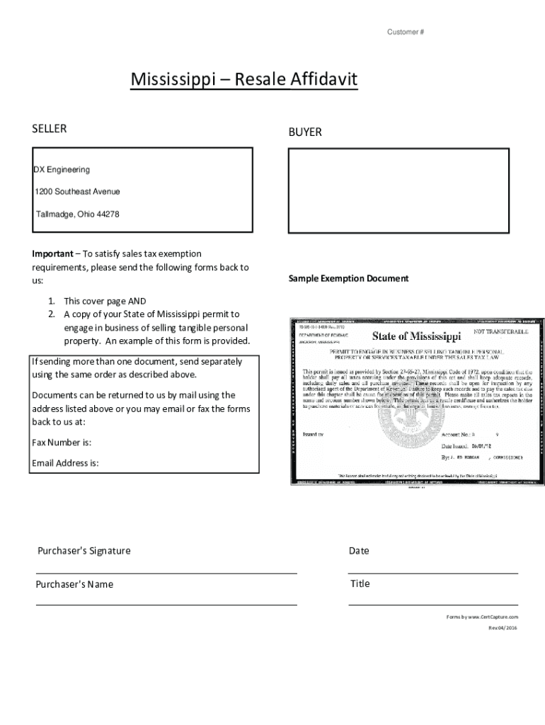 Customer #MississippiResaleAffidavit SELLERBUYERDX Engineering1200 Southeast Avenue Talmadge, Ohio 44278ImportantTosatisfysalestaxexemption requirements, pleasesendthefollowingformsbackto us:SampleExemptionDocument1.