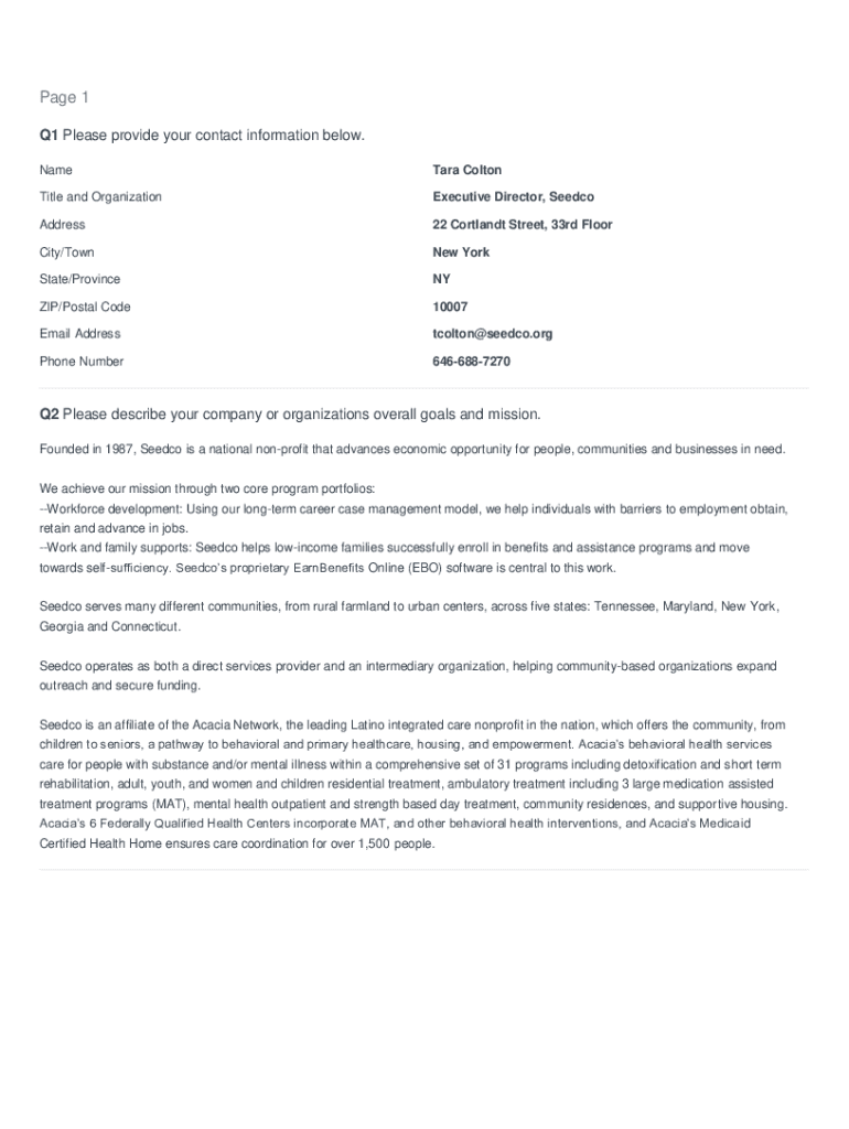 Page 1 Q1 Please provide your contact information below. Name Tara ColtonTitle and OrganizationExecutive Director, SeedcoAddress22 Cortland Street, 33rd Fluidity/Townes Yorkshire/ProvinceNYZIP/Postal