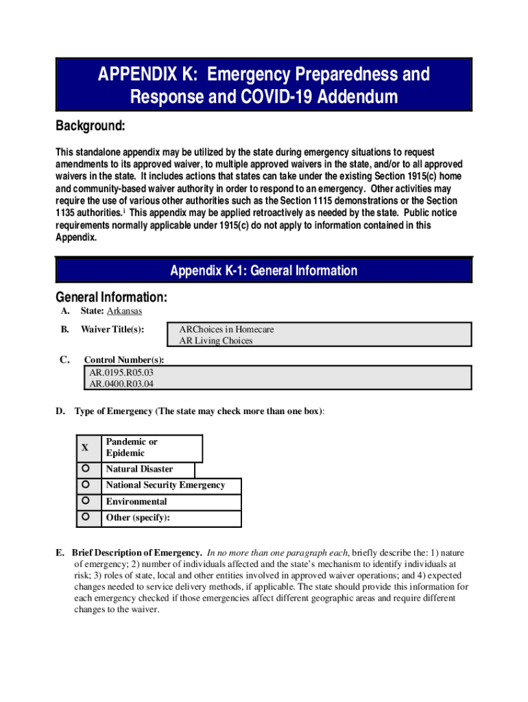 APPENDIX K: Emergency Preparedness and Response and COVID-19 Addendum Background: This standalone appendix may be utilized by the state during emergency situations to request amendments to its approved