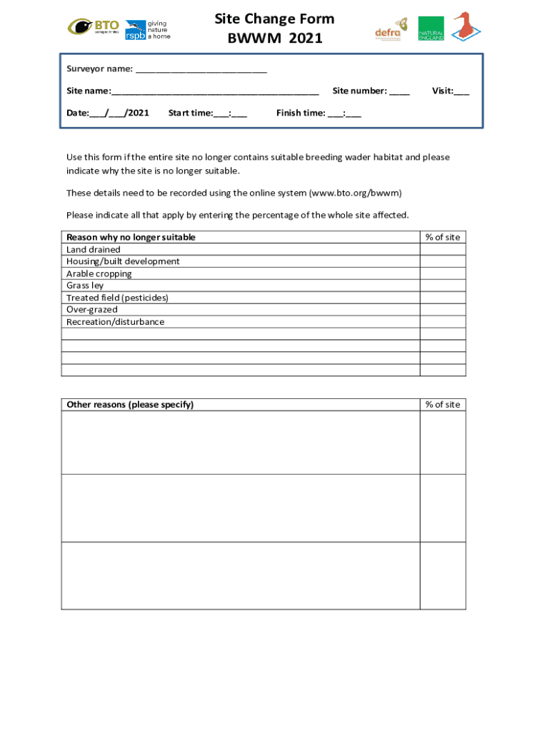 Site Change Form BWM 2021 Surveyor name: Site name: Date: / /2021Start time: : Site number: Visit: Finish time: : Use this form if the entire site no longer contains suitable breeding wader habitat,