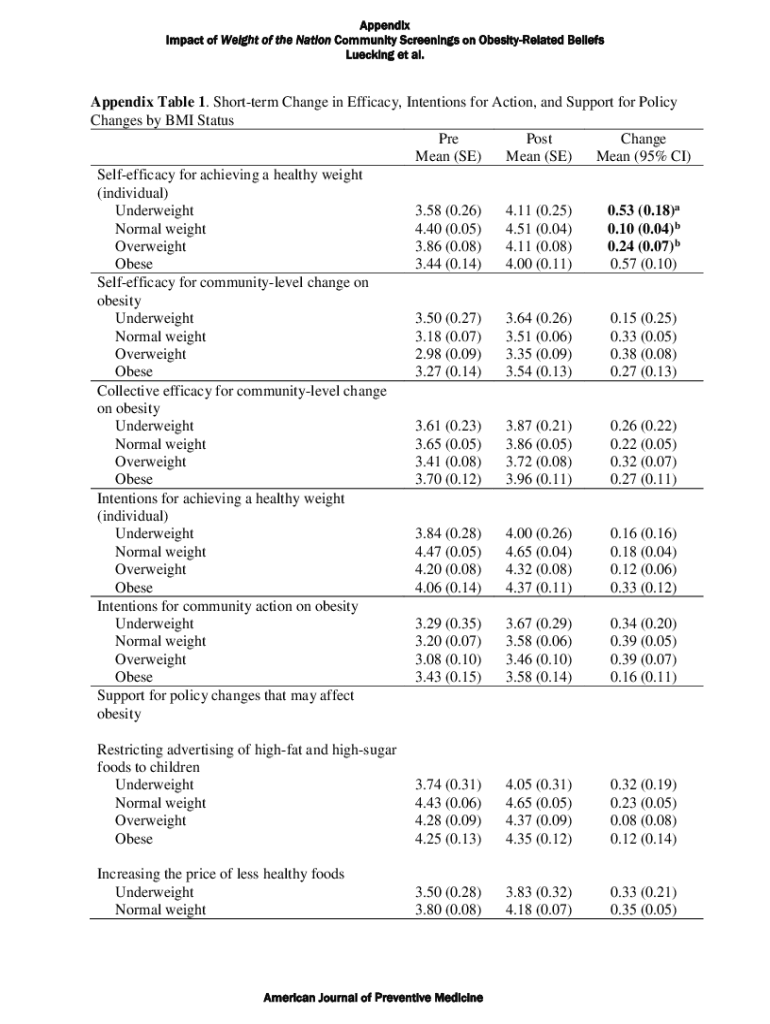 Appendix Impact of Weight of the Nation Community Screenings on ObesityRelated Beliefs Lucking et al. Appendix Table 1. Short term Change in Efficacy, Intentions for Action, and Support for Policy