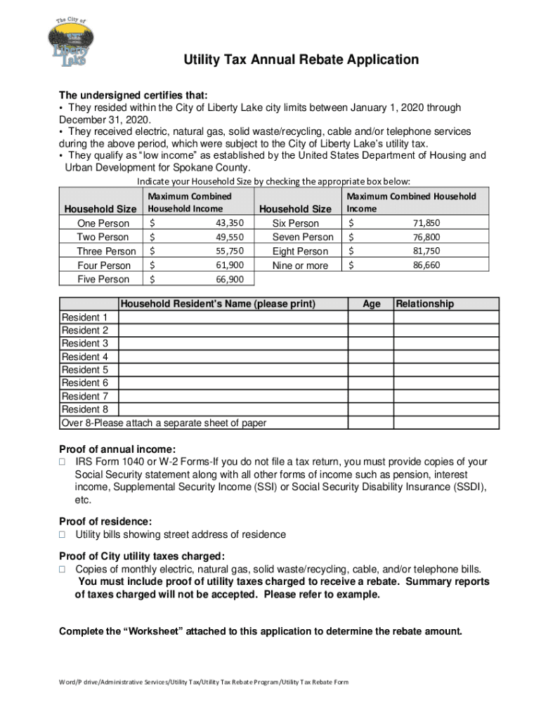 Utility Tax Annual Rebate Application The undersigned certifies that: They resided within the City of Liberty Lake city limits between January 1, 2020, through December 31, 2020. They received electric,