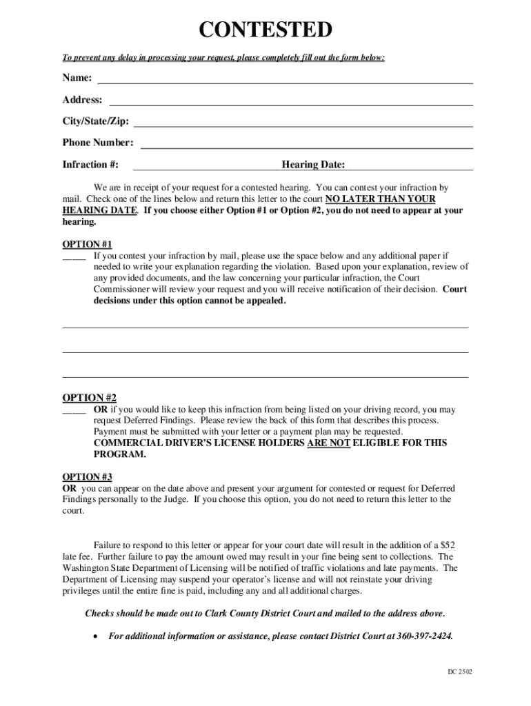 CONTESTED To prevent any delay in processing your request, please completely fill out the form below:Name: Address: City/State/Zip: Phone Number: Infraction #:Hearing Date:We are in receipt of your