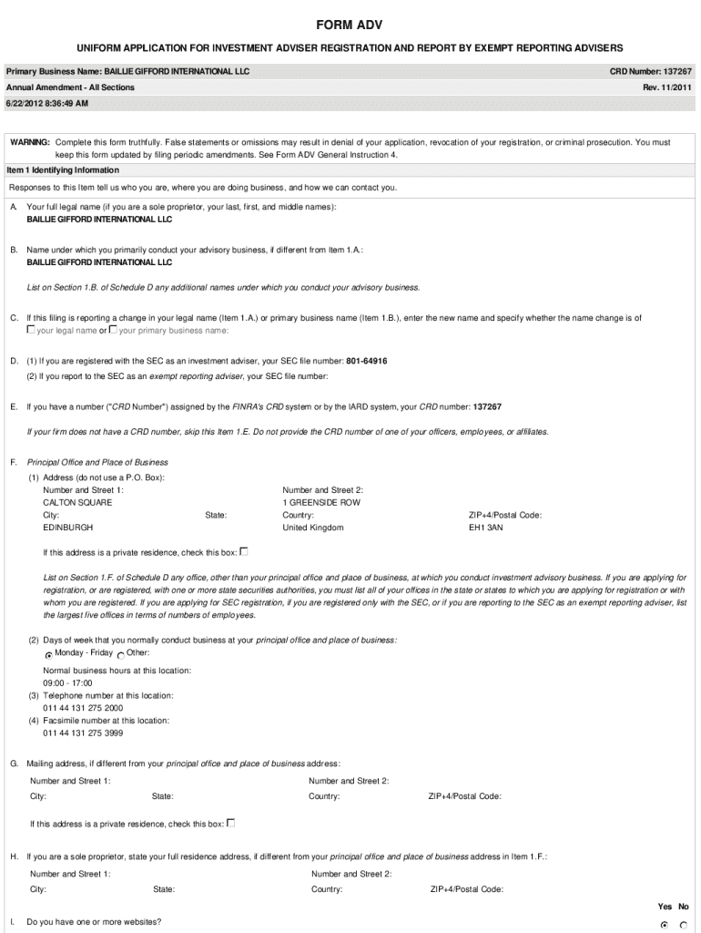 FORM ADV UNIFORM APPLICATION FOR INVESTMENT ADVISER REGISTRATION AND REPORT BY EXEMPT REPORTING ADVISERS Primary Business Name: BAILLIE GIFFORD INTERNATIONAL LLC CRD Number: 137267Annual Amendment