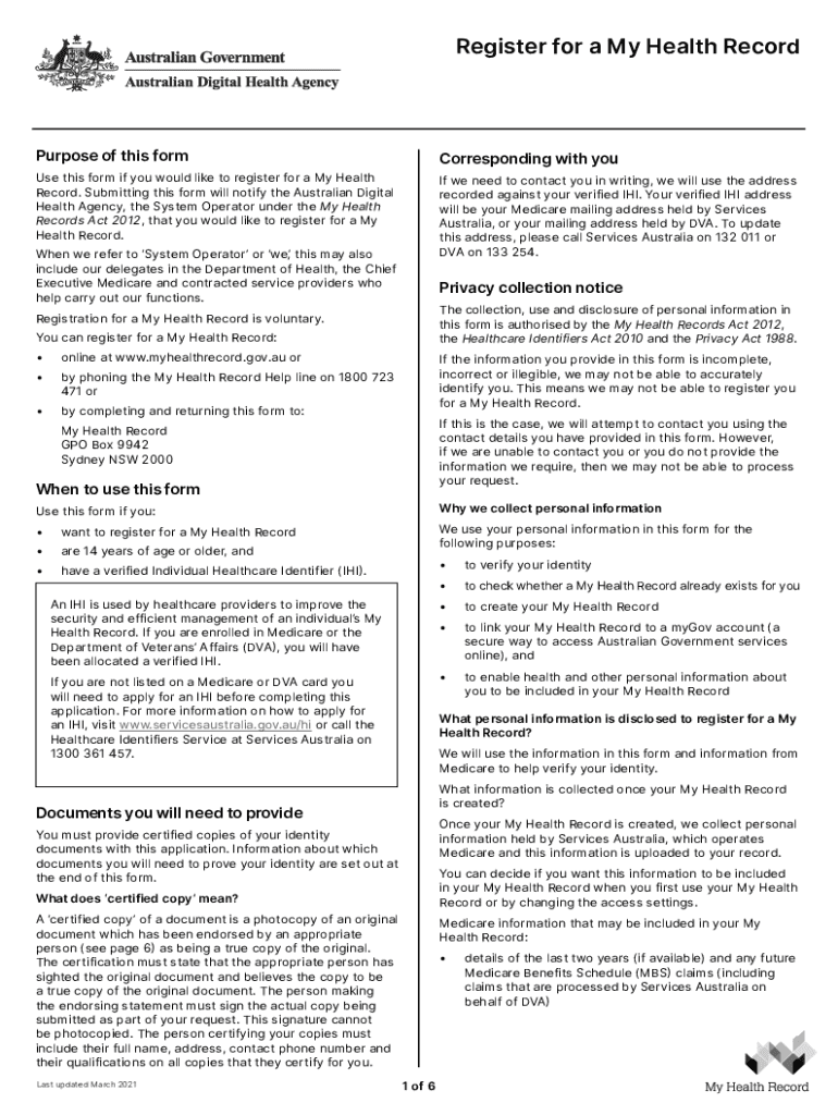Register for a Health RecordPurpose of this formCorresponding with house this form if you would like to register for a My Health Record. Submitting this form will notify the Australian Digital Health