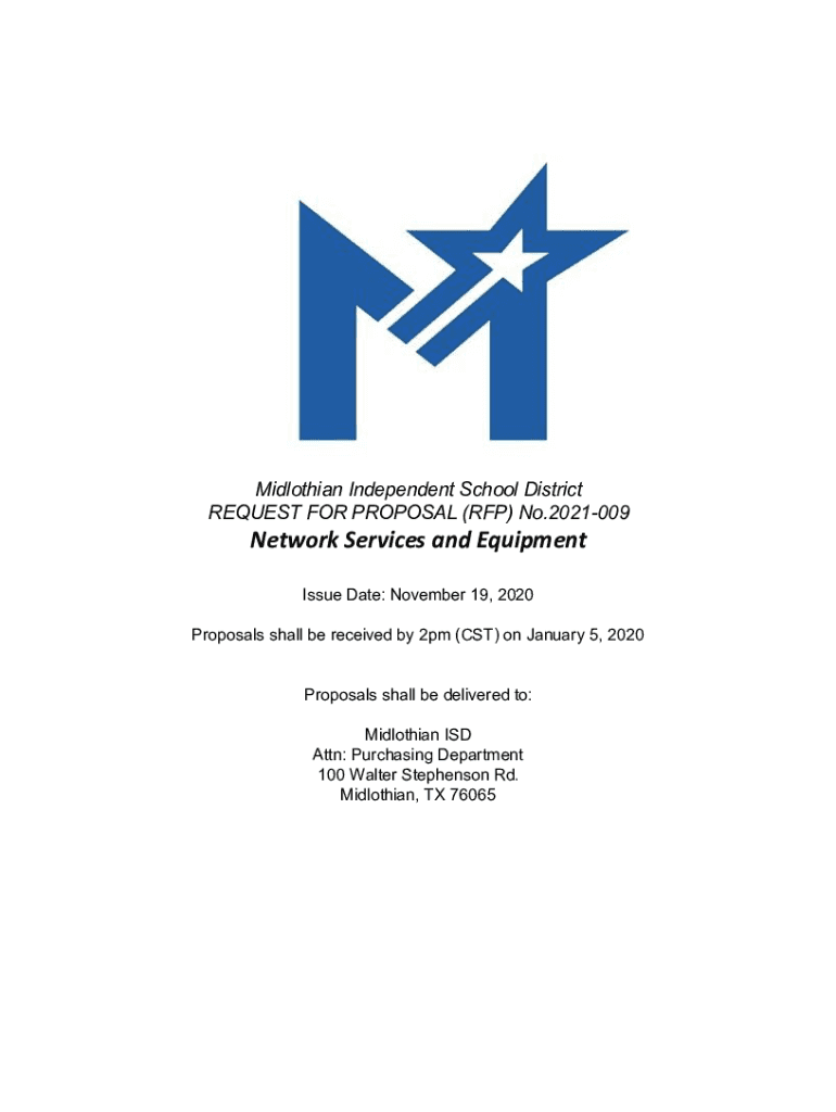 Midlothian Independent School District REQUEST FOR PROPOSAL (RFP) No.2021009Network Services and Equipment Issue Date: November 19, 2020, Proposals shall be received by 2pm (CST) on January 5, 2020,