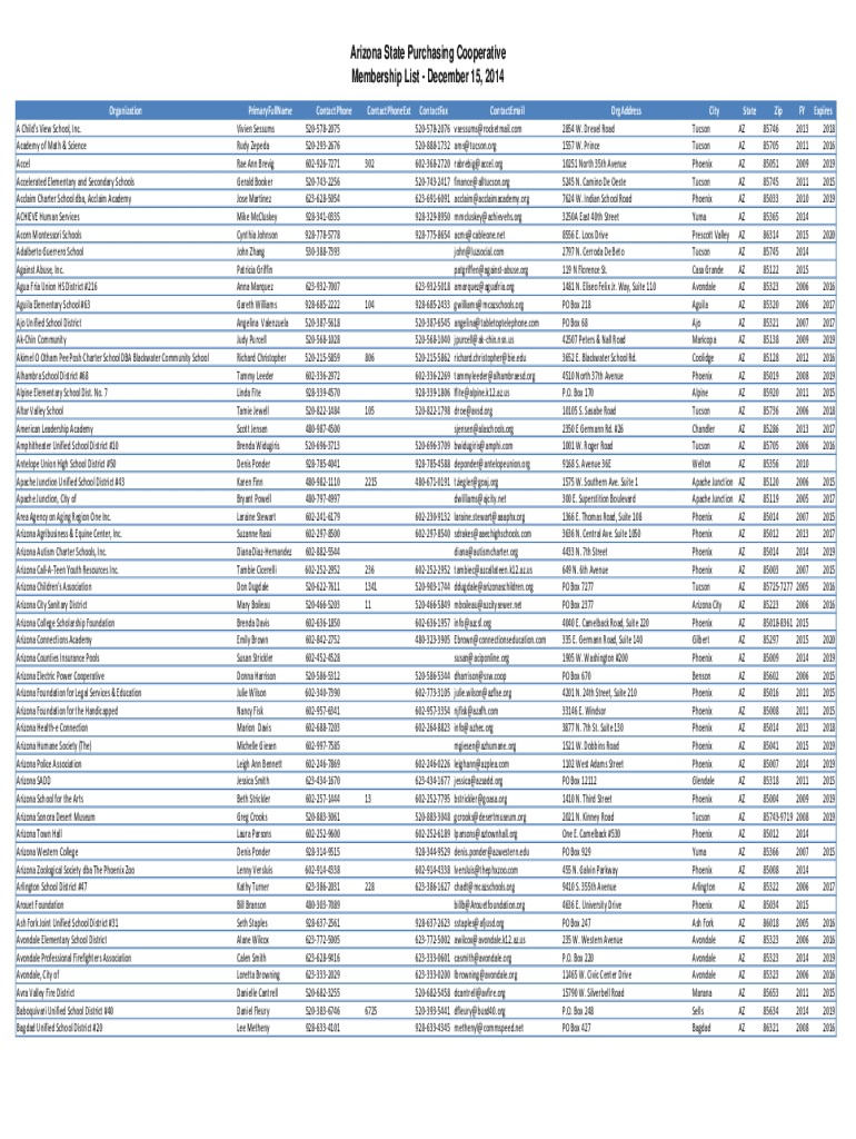 Arizona State Purchasing Cooperative Membership List December 15, 2014, Organization Child 'sViewSchool, Inc. AcademyofMath&Science AFCEL AcceleratedElementaryandSecondarySchools AcclaimCharterSchooldba,