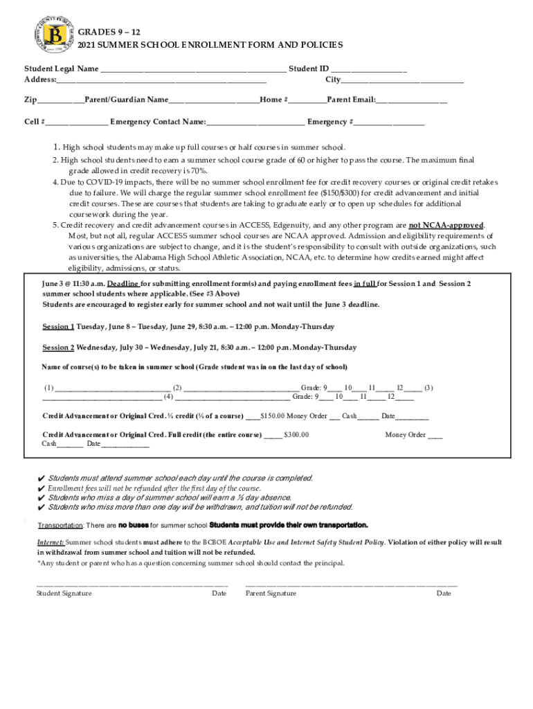 GRADES 9 12 2021 SUMMER SCHOOL ENROLLMENT FORM AND POLICIES Student Legal Name Student ID Address: City Zip Parent/Guardian Name Home # Parent Email: Cell # Emergency Contact Name: Emergency # 1.