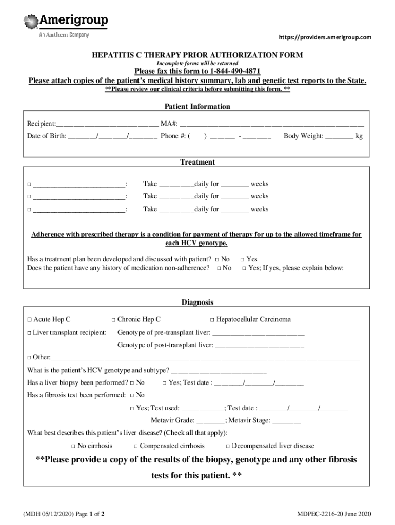 Https://providers. Amerigroup.hepatitis C THERAPY PRIOR AUTHORIZATION FORM Incomplete forms will be returnedPlease fax this form to 18444904871 Please attach copies of the patients medical history