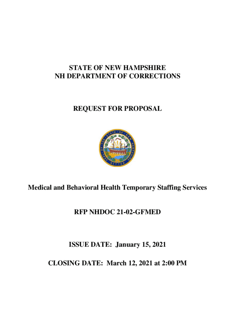 STATE OF NEW HAMPSHIRE NH DEPARTMENT OF CORRECTIONSREQUEST FOR PROPOSALMedical and Behavioral Health Temporary Staffing Services RFP NH DOC 2102GFMEDISSUE DATE: January 15, 2021, CLOSING DATE: March