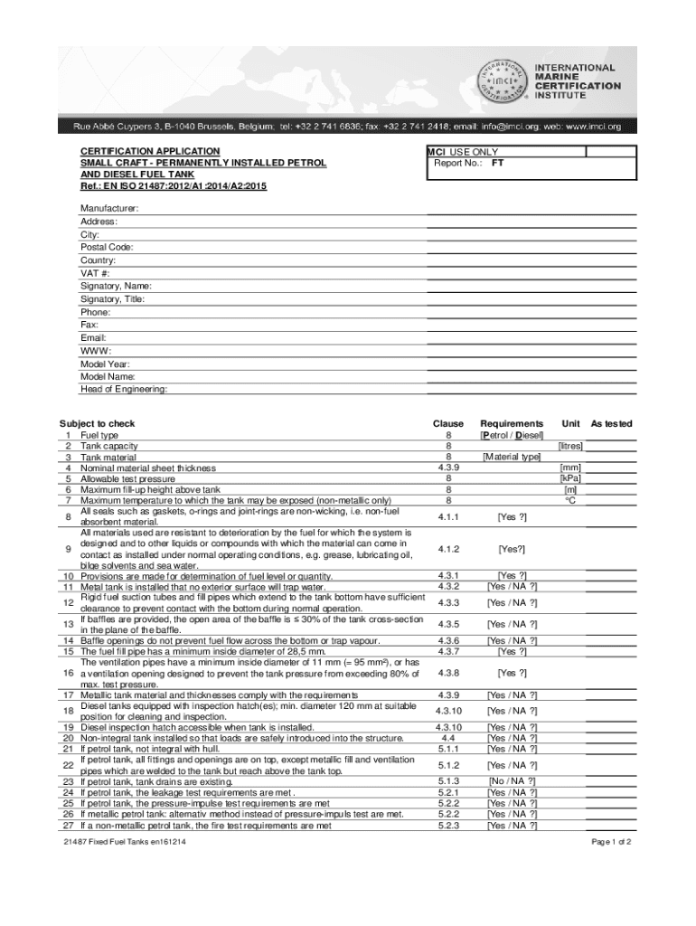 CERTIFICATION APPLICATION SMALL CRAFT PERMANENTLY INSTALLED PETROL AND DIESEL FUEL TANK Ref.: EN ISO 21487:2012/A1:2014/A2:2015MCI USE ONLY Report No.: Manufacturer: Address: City: Postal Code: Country: