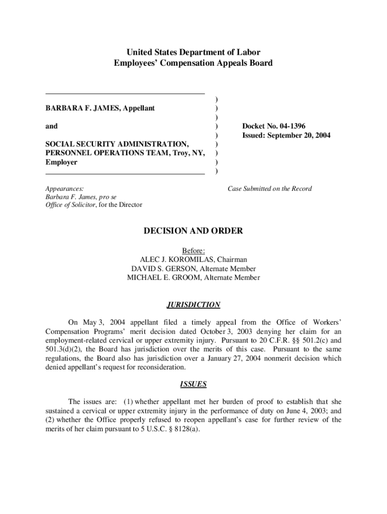 United States Department of Labor Employees Compensation Appeals Board BARBARA F. JAMES, Appellant and SOCIAL SECURITY ADMINISTRATION, PERSONNEL OPERATIONS TEAM, Troy, NY, Employer)))))))))Appearances:
