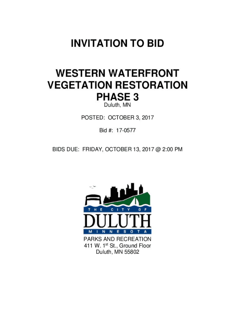 INVITATION TO BID WESTERN WATERFRONT VEGETATION RESTORATION PHASE 3 Duluth, MN POSTED: OCTOBER 3, 2017, Bid #: 170577BIDS DUE: FRIDAY, OCTOBER 13, 2017 2:00 MARKS AND RECREATION 411 W. 1st St., First