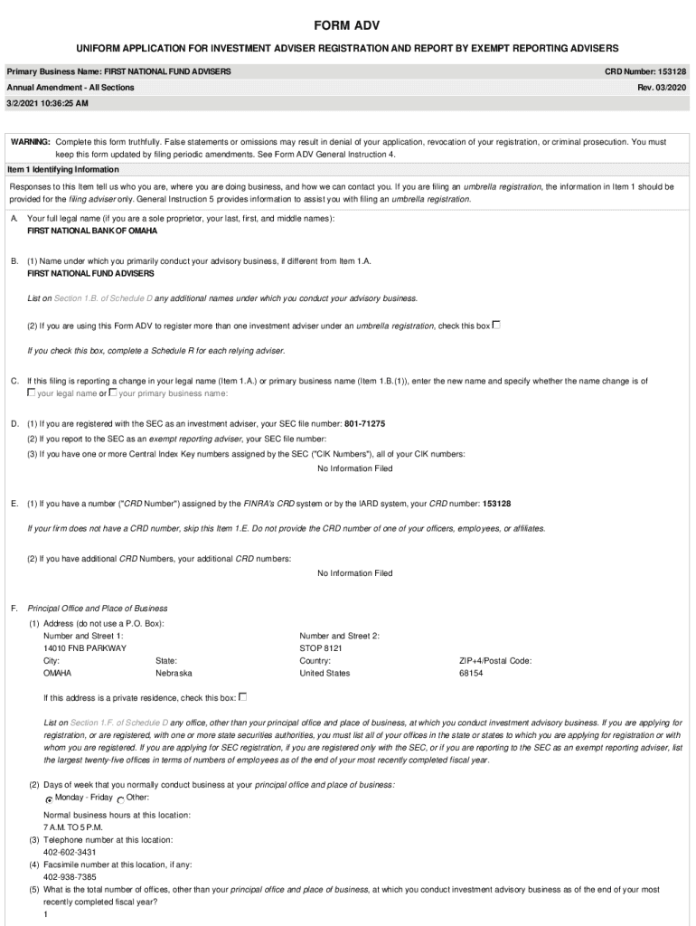 FORM ADV UNIFORM APPLICATION FOR INVESTMENT ADVISER REGISTRATION AND REPORT BY EXEMPT REPORTING ADVISERS Primary Business Name: FIRST NATIONAL FUND ADVISERS CRD Number: 153128Annual Amendment All