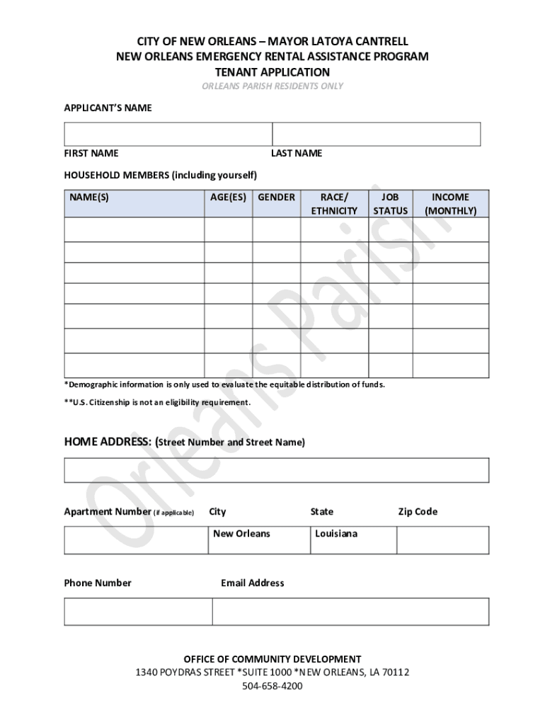 CITY OF NEW ORLEANS MAYOR LATOYA CANTRELL NEW ORLEANS EMERGENCY RENTAL ASSISTANCE PROGRAM TENANT APPLICATION ORLEANS PARISH RESIDENTS ONLYAPPLICANTS NAMEFIRST NAMELESS NAMEHOUSEHOLD MEMBERS (including
